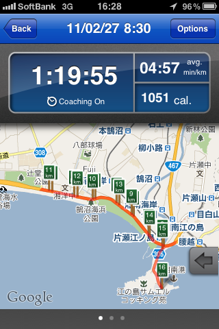 今日は前半8kmは5分30秒/kmの余裕のあるペースで走り、後半上げていく作戦だった。 しかしレースがスタートすると、ゆっくり走っているつもりが、スイスイ走れてしまう。ということで、なるべく自重しながらも、ハイペースで走ることになった。 1km毎のラップタイムは下記の通り。 2km:5分12秒 3km:5分09秒 4km:5分08秒 5km:5分04秒 6km:5分00秒 7km:4分57秒 8km:4分57秒 9km:4分51秒 10km:4分53秒 11km:4分53秒 12km:4分53秒 13km:4分54秒 14km:4分41秒 15km:5分00秒 16km:4分42秒 ということで、作戦通り、6?8kmまではマイペース、その後は少しギアを上げるも一定ペースで走ることができた。 これも、iPhone片手にRunkeeprと睨めっこしながら走ったが、走った成果か。 この調子でいけば、6週間後のハーフは1時間50分前後で走れそうだ。 x